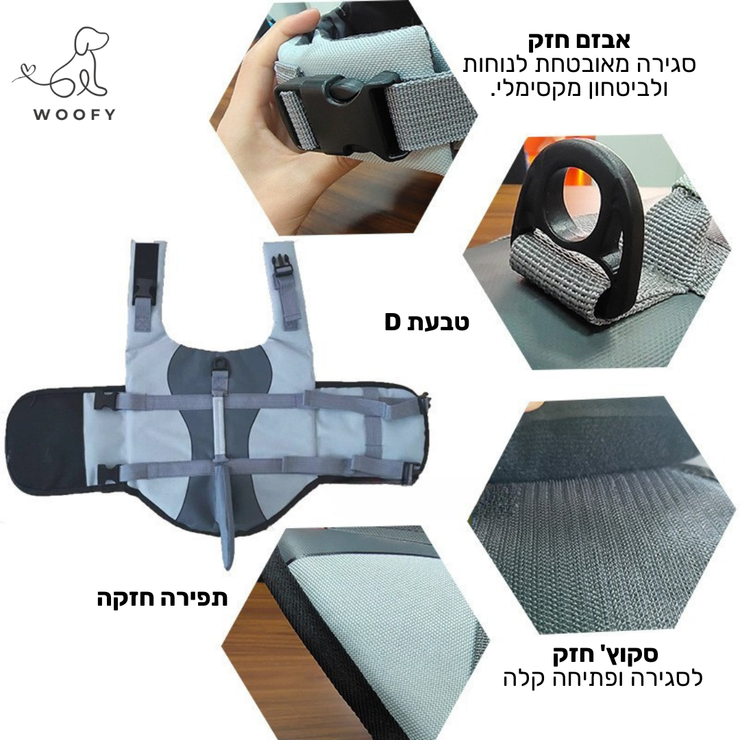 🔹 ידית הצלה מובנית – מאפשרת שליטה קלה ומשיכה בטוחה של הכלב מחוץ למים בעת הצורך.